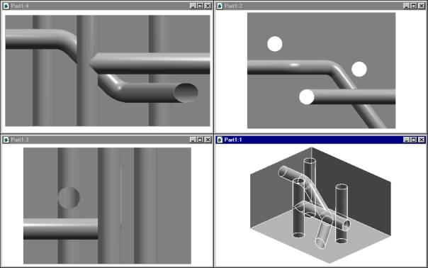 Hierbei werden die Bohrungen plaziert und anschließend das Bauteil als dünnwandig mit offenen Teilflächen definiert. Man kann nun die Bohrungen als Röhren sehr gut auf eventuelles Durchdringen kontrollieren. Bei dieser Vorgehensweise ist darauf zu achten, daß so viele Teilflächen bestehen bleiben, daß noch alle Röhrenwandungen mit dem Grundkörper verbunden sind.