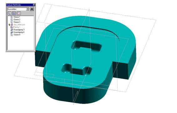 Im nächsten Konstruktionsschritt werden durch Erzeugung einer Ausprägung, unter Berücksichtigung der Blechdicke (parallele Referenzebene im Abstand von 2 mm), die äußeren Abmaße der Matrize ergänzt. Hierbei wird die innere Kontur in der Profilumgebung wieder einbezogen, jedoch nur bis zur Mitte des eingefügten Blechs konstruiert. Die äußeren Konturen sind in diesem Beispiel frei wählbar.